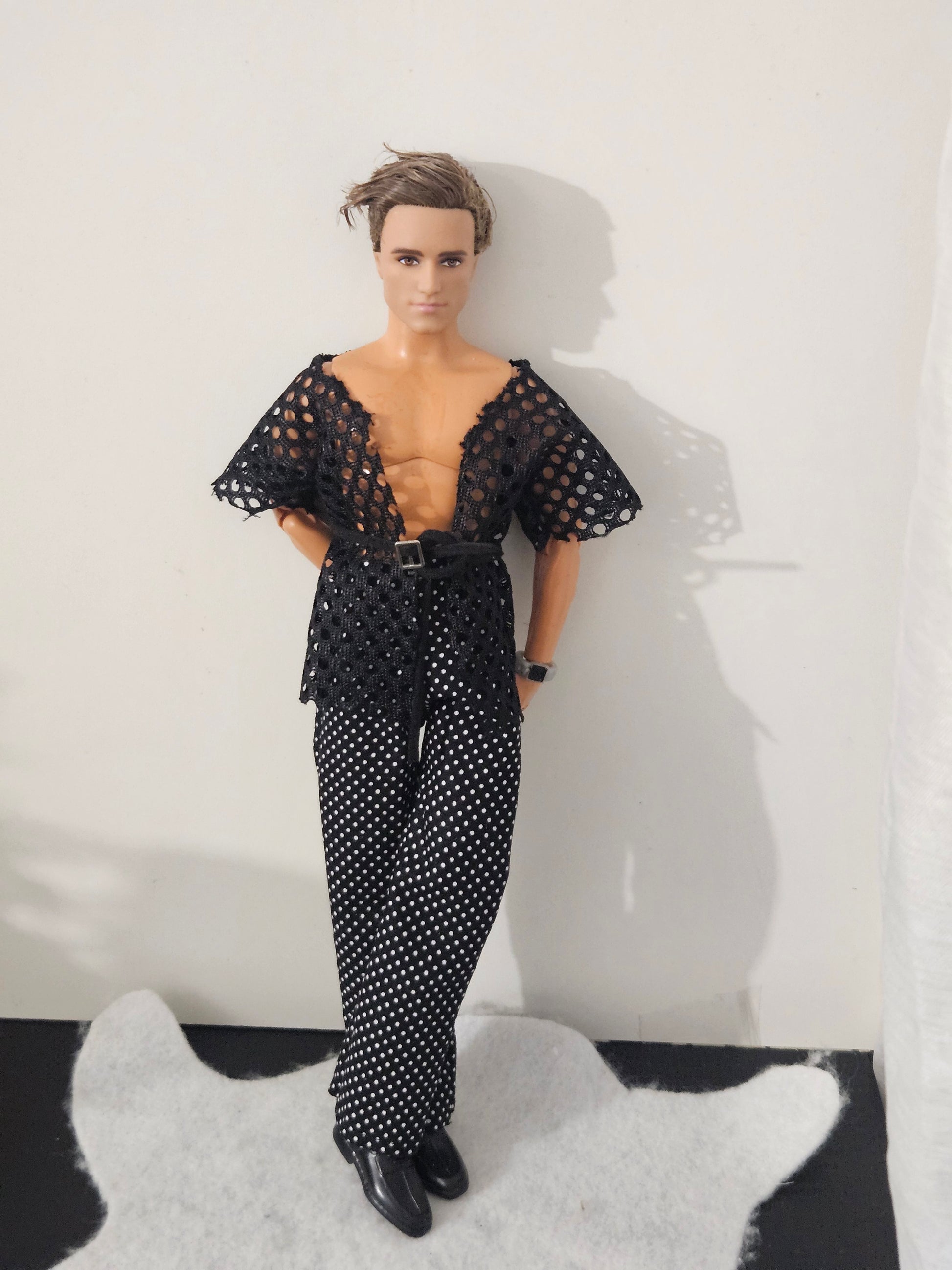 Polka dots pant with mesh shirt. Briefcase-style bag included